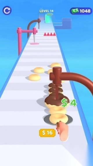 1. 展示关卡、货币、甜甜圈加工场景以及收益等要素,玩家要操控“袜子”这一角色(图中呈现为脚状形象)在跑道上进行甜甜圈加工等操作,玩法融合休闲跑酷与经营。