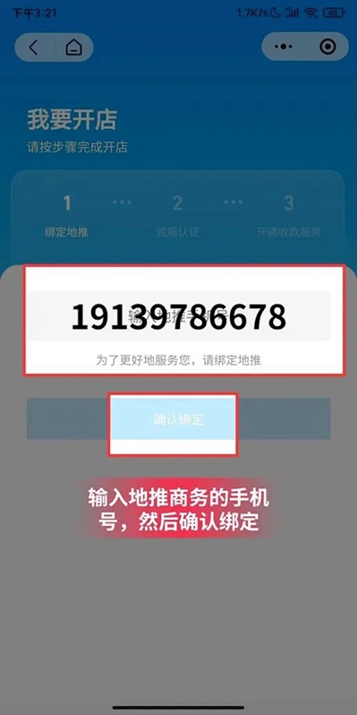 4、输入地推商务手机号后“确认绑定”(没有地推商户手机号无法入驻哦)