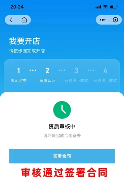 9、资质认证:去签署合同,然后等待审核通过,可以点左上角箭头"<"返回,再重新进入,起到一个随时刷新审核状态的作用