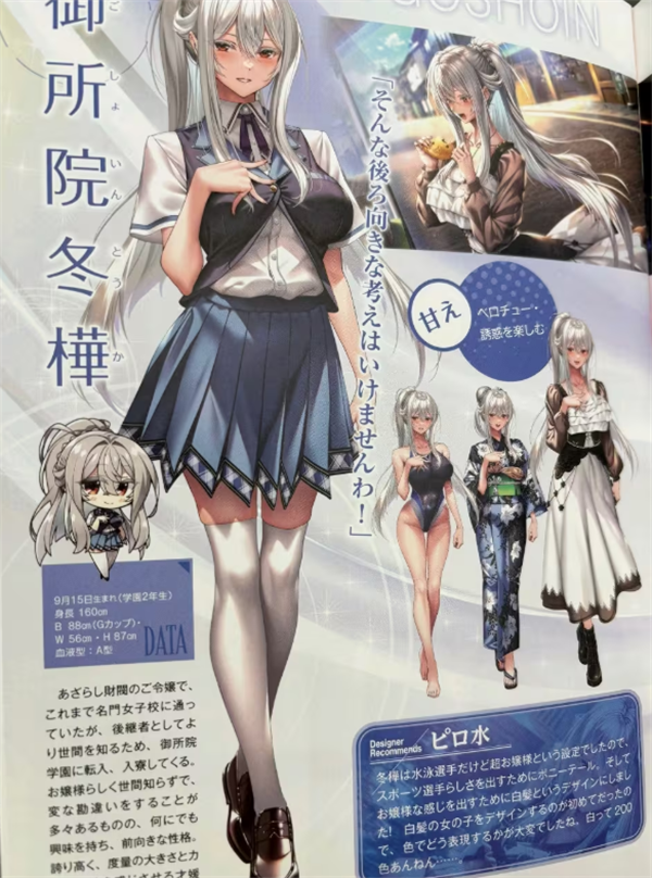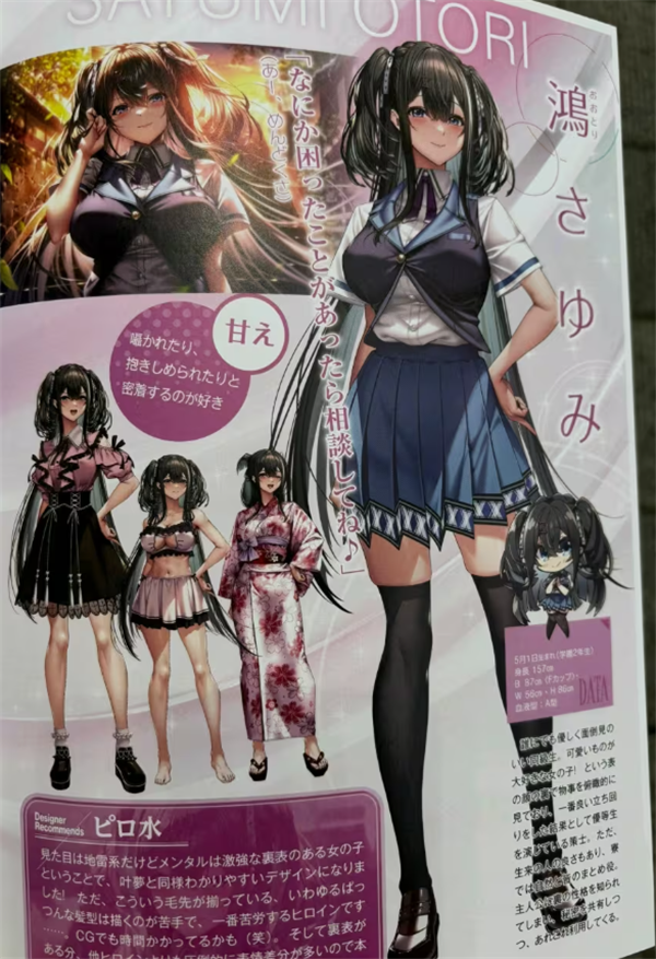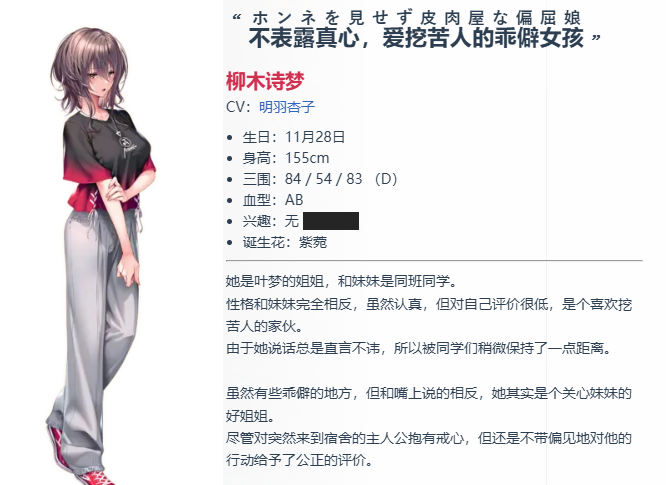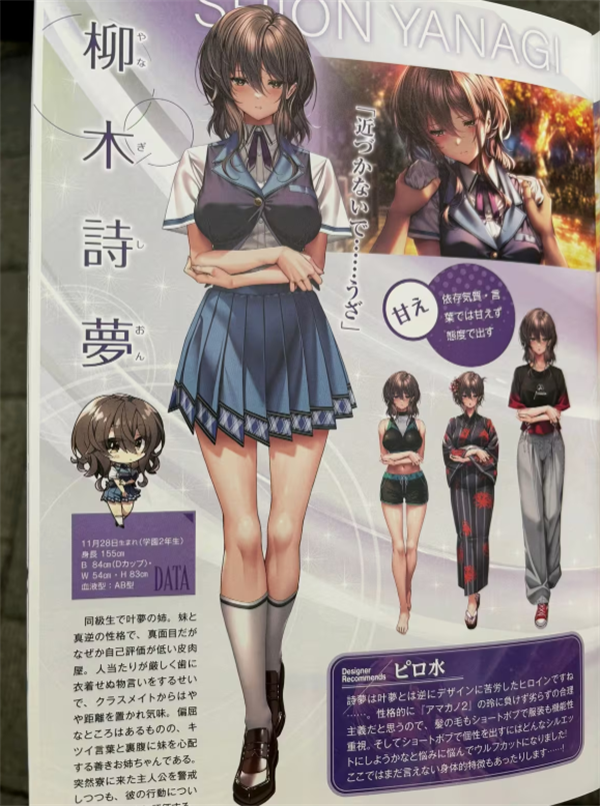 水老师的创作思路:我想让她外表看起来虽然是个地雷系但是内心却很坚强的表里分明的女孩,和叶梦一样采用了简单易懂的设计。但是,我对于画这种发梢整齐的,也就是比较利落的发型很不擅长,所以这是最费功夫的女主角……。画CG的时候也很费时间(笑)。然后由于是表里分明的性格,所以表情差分的数量相比其他女主角是压倒性的多(后面的一点内容由于不完整,故不作翻译,接着下一个角色)