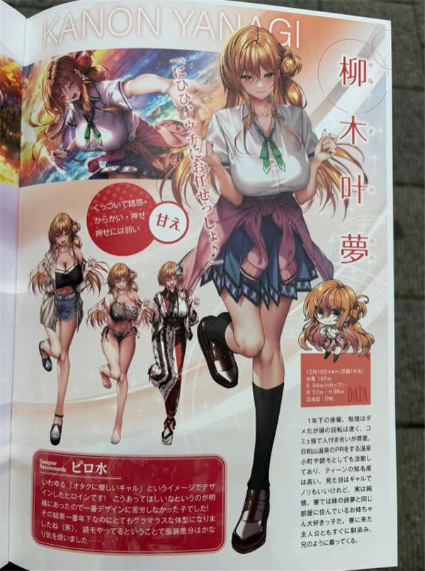 水老师的创作思路:以“对宅男也很温柔”的印象设计的女主角。因为明确想要的就是这样的,所以这是最容易设计的一个角色了!结果就是明明年龄是最小,体型却十分轻盈(笑)。因为是杂志模特,所以服装差分还是挺费心的……。