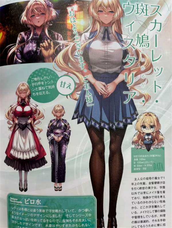 水老师的创作思路:斯卡蕾特是以与冬桦不一样的、不问世事的(由于不知道「レティ」这个词的具体意思,因此我只能按照我自己的理解来翻译,MD,这个「レティ」到底是什么意思啊!)、虚幻的为印象设计出来的角色,请好好期待哦……!这样的女孩来做女仆什么的最棒了!!