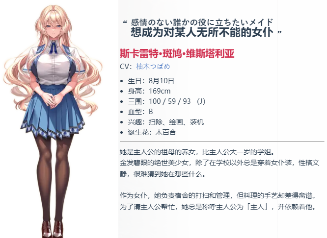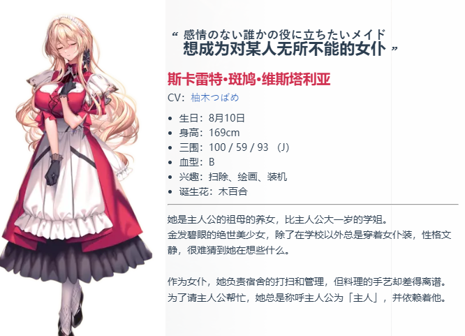 斯卡蕾特·斑鸠·维斯塔莉娅:不表露感情,想做一个能帮助他人的女仆。