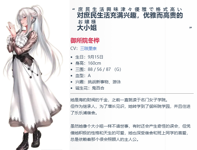 3号女主御所院冬桦,是知名集团的千金大小姐。