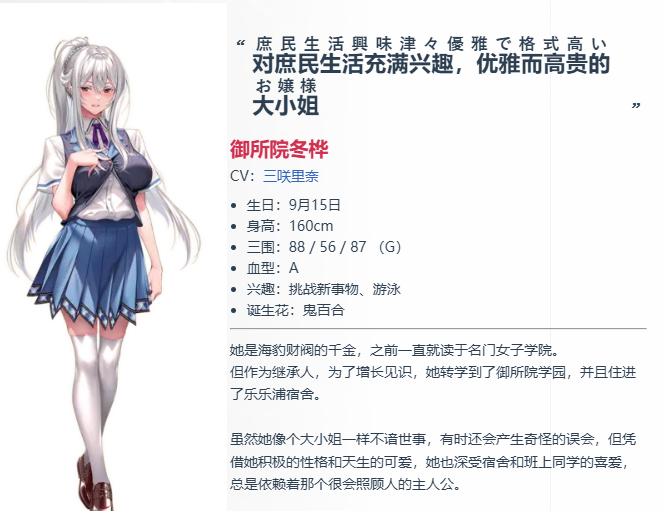 介绍:海豹财团的大小姐,虽然之前一直都在贵族女子学校上学,但身为继承人的她为了了解普通人的生活而转入御所院学园,住进了“楽々浦寮”。她就像大小姐一样不谙世事,经常会犯一些奇奇怪怪的错误,对什么都抱有兴趣,性格积极乐观。自尊心很强的同时,气量又很大,是个能让人感受到领袖感的才女[后面由于文字不全无法翻译,故暂时搁置(嘻嘻)]