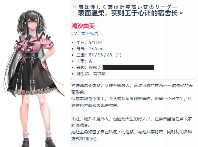 介绍:对谁都很温柔很会照顾人的同级生。非常喜欢可爱的东西的女孩!在这样的表面背后,却是一个深谋远虑,总是以最优策略行事,扮演者优等生的谋士。但天性中的善良还未消失,在宿舍里自然的成为了众人的主心骨。被主人公知道了“里人格”后,一边与其分享秘密,一边这样那样地利用他。