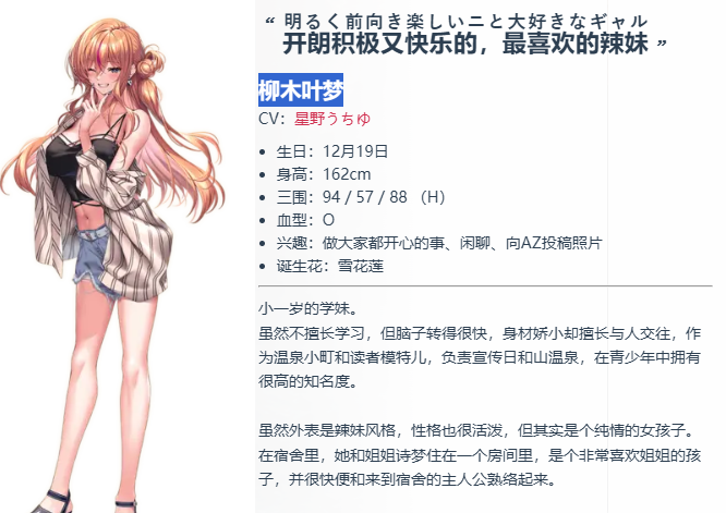 柳木叶梦:又积极又开朗,喜欢让人快乐的事的辣妹。