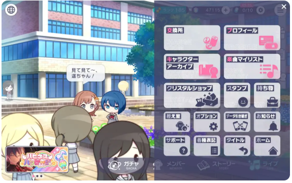 下方从左到右分别为:GACHA(抽卡)、MEMBER(人物)、STORY(剧情)、LIVE(打歌)