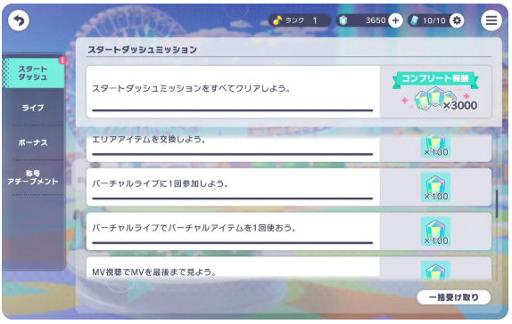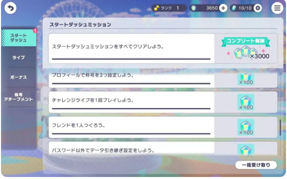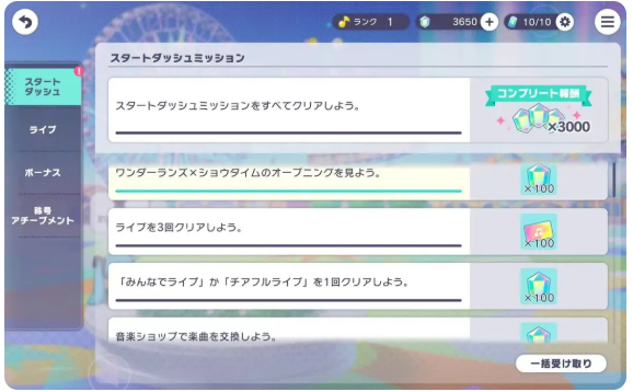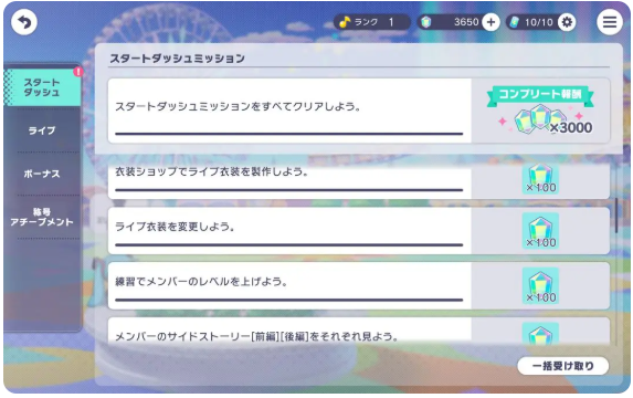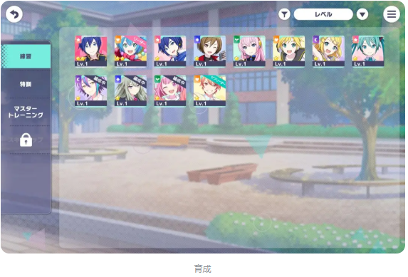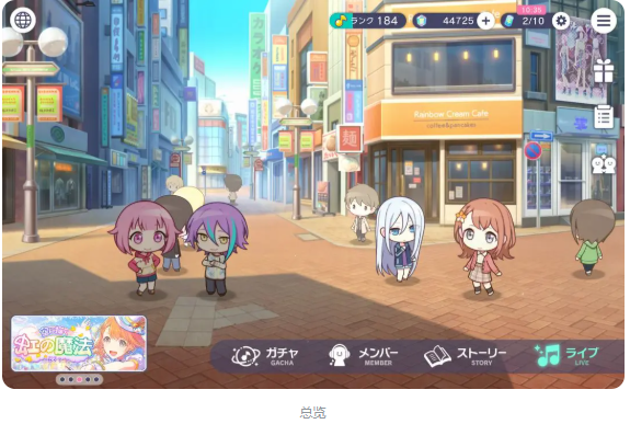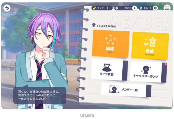 总体包括编成、育成、“ライブ衣装”【现场服装】、“キャラクターランワ”【角色等级】、“メンバー一覽”【会员名单】