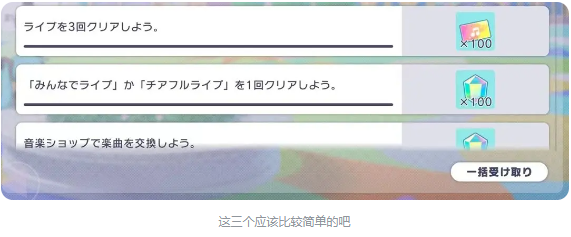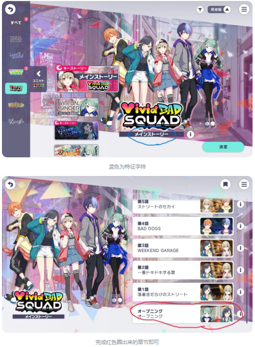 前5个完成方法很简单、进入MAINSTORY(主线剧情)、选择各个团,右上角改一下“開催順”,选择第一章(章节带有“メインストーリー”),每个团的第一章点进去,完成下图红色圈出来的部分。