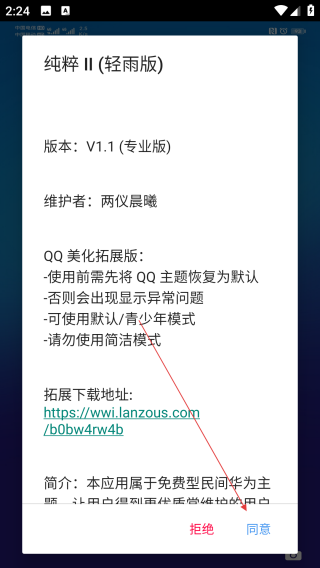 1、打开华为主题里的纯粹轻雨,点击【同意】按钮。