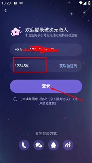 3、在登录页面填写验证码,勾选协议后,点击登录完成账号登录操作。