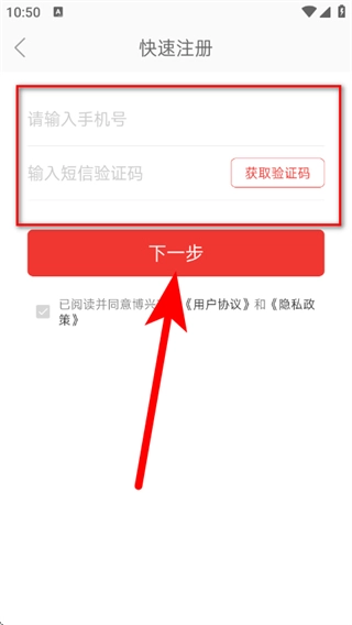 4、输入手机号,获取并输入短信验证码,点击下一步,完成账号注册。