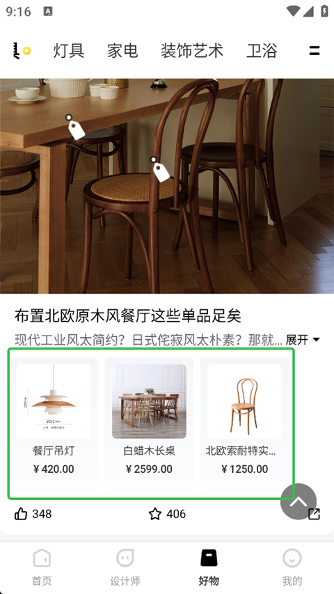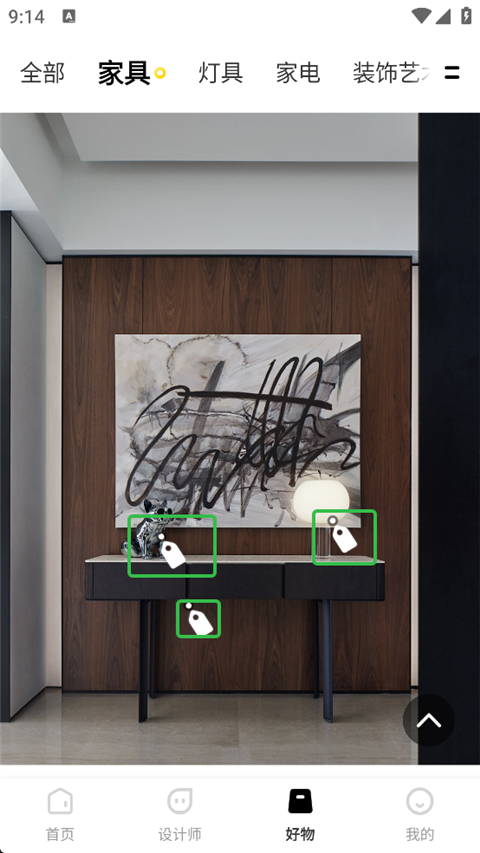 2、用户可以在此页面浏览各种家具、灯具、装饰艺术等,看见喜欢的可以点击飘动的标签进行查看。