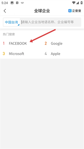 3、选好地区后,我们点击热门搜索中的【FACEBOOK】,快速发起企业查询呢。