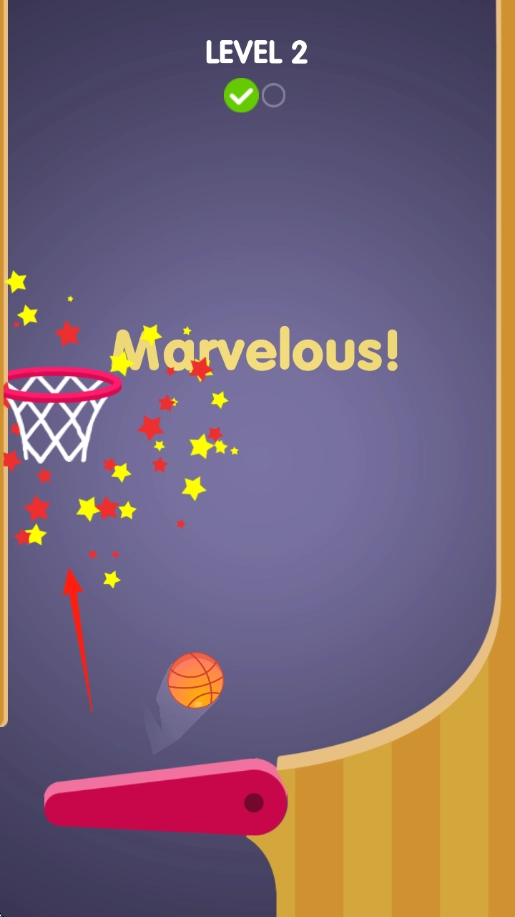 3、在关卡结算阶段,当球员进球后,屏幕会显示“Marvelous!”,随后游戏自动推进至“LEVEL2”。在此过程中,系统会累计玩家的得分以及星级。玩家可凭借此继续挑战难度更高的投篮关卡。