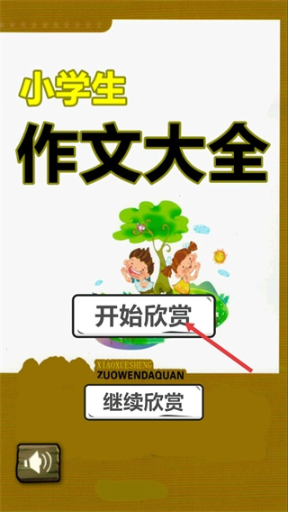 1、点击【开始欣赏】即可进入【小学生作文大全】界面,此界面设有作文专辑的入口,同时配备【继续欣赏】按钮,方便用户接续浏览相关内容。