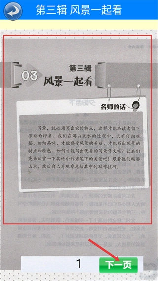 3、进入【第三辑-风景一起看】后,查看【名师的话】里的写景技巧,点击【下一页】按钮即可浏览具体的作文内容。