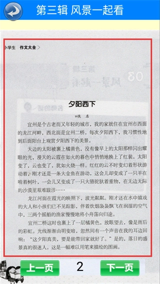 4、浏览到【夕阳西下】这篇写景作文,通过【上一页】、【下一页】按钮切换页面,阅读这篇作文的详细内容。