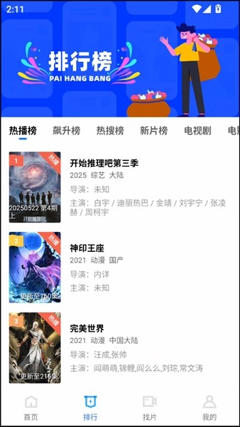 2、在排行榜界面下,能够看到热播、飙升、热搜、新片、电视剧、电影等一系列综合排行榜。