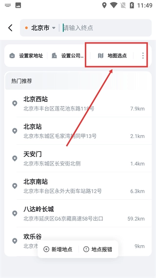 3、在目的地输入界面,点击【地图选点】,从热门推荐中选择终点,灵活设置行程的目的地。