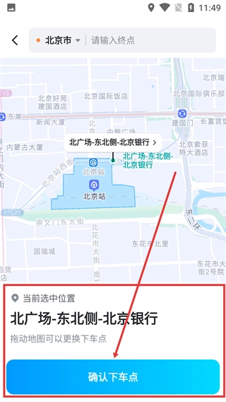 4、在地图界面查看【当前选中位置】,确认无误后点击【确认下车点】,完成行程终点设置步骤。