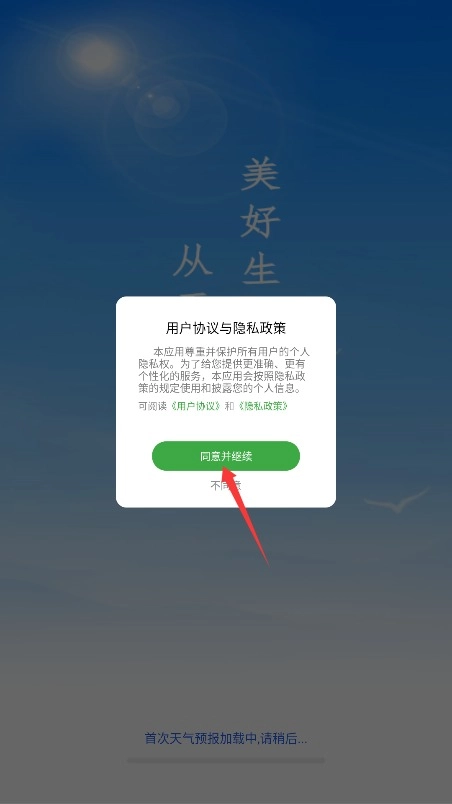 1、首次使用时,请仔细阅读平台的服务条款和隐私政策,确认无误后点击同意并继续,即可进入应用。