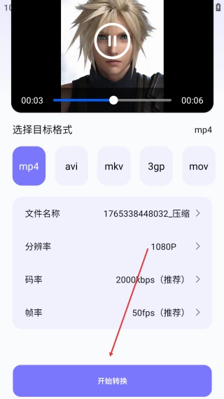 4、在设置页,选好目标格式后点击【开始转换】,即可完成视频格式转换。