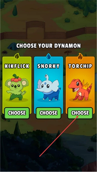 1、这是口袋妖怪的世界界面,提供KIKFLICK、SNORKY、TORCHIP三只初始口袋妖怪供选择,点击对应角色下方的CHOOSE按钮,就能选定初始伙伴并开启游戏。
