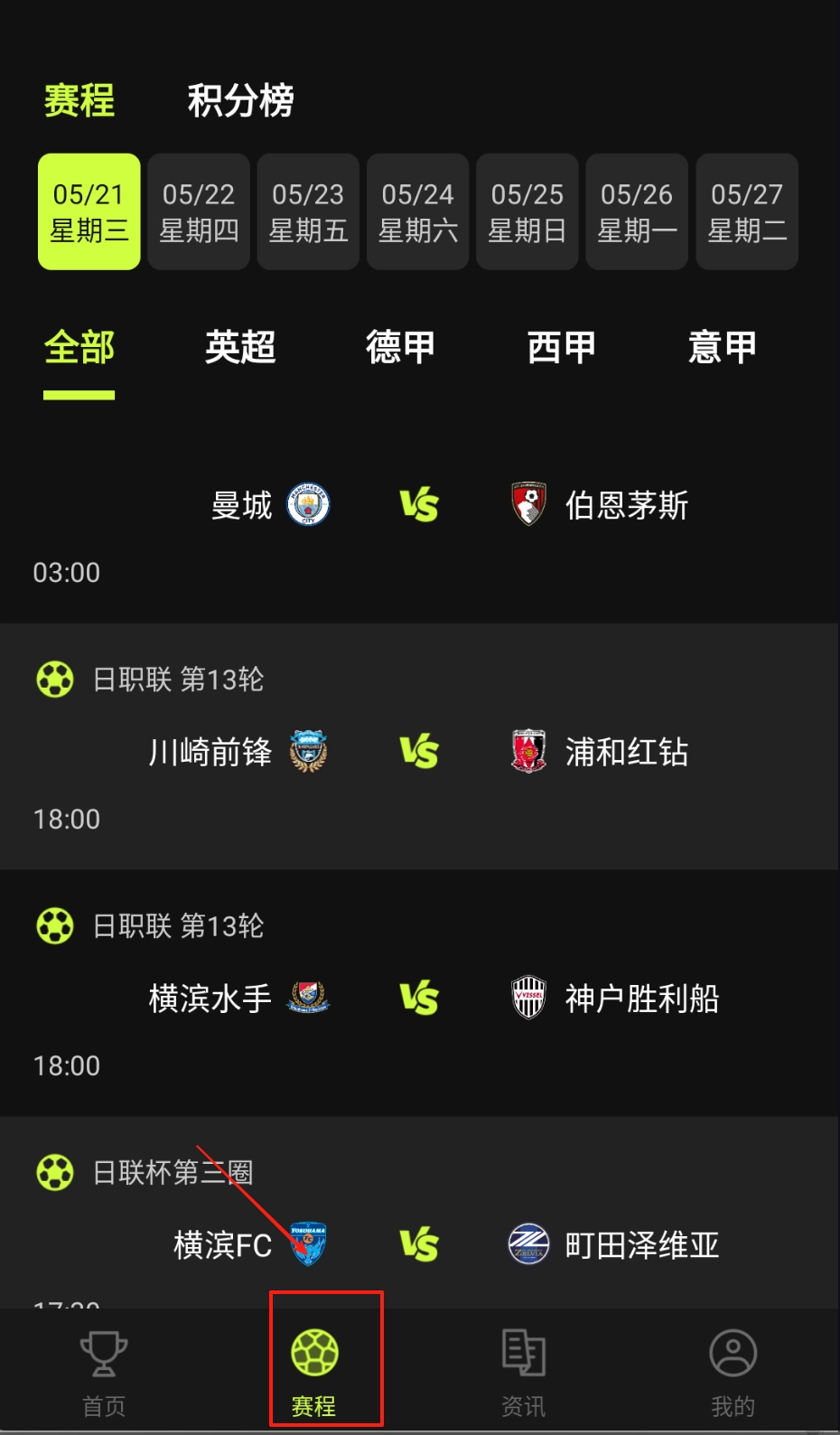 2、主界面的“赛程”板块依据日期对赛事进行排列,当天的比赛会以绿色高亮显示。点击英超、欧冠等分类标签,就能快速查看伯恩茅斯对阵西汉姆联等具体赛事的开球时间。