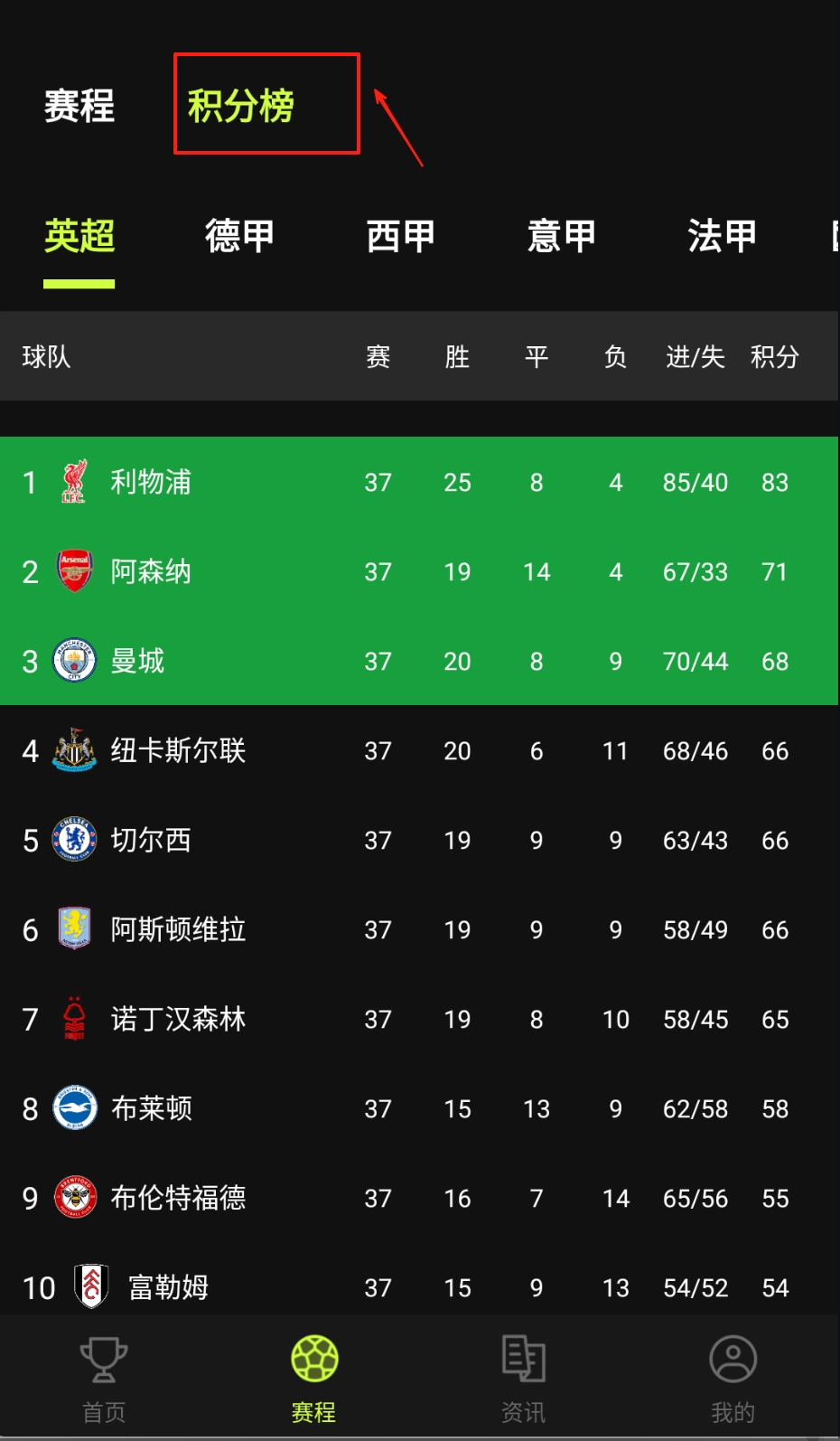 3、切换"积分榜"查看欧冠排名,绿色背景突出利物浦、巴萨等领跑球队,积分、胜平负数据和净胜球对比一目了然哦。