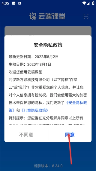 1、打开云端课堂后,阅读《安全隐私政策》,点击【同意】按钮以进入登录界面。