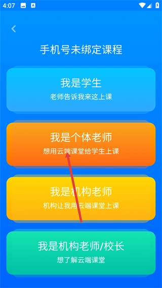 3、登录后进入手机号绑定课程页面,选择对应身份(如“我是个体老师”),进入信息填写界面。