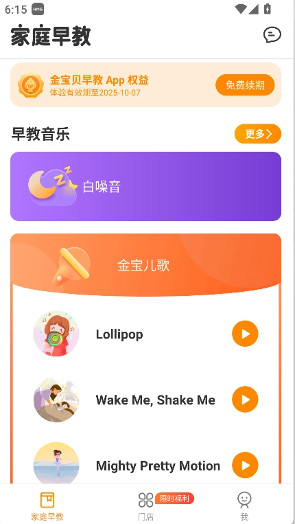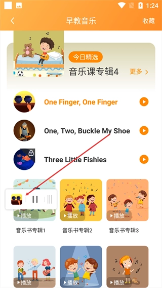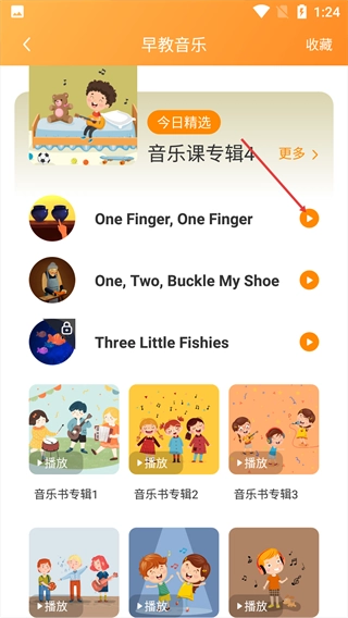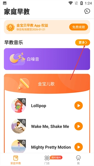 1、进入【家庭早教】页面后,定位到【早教音乐】板块,点击该板块右侧的【更多】按钮。