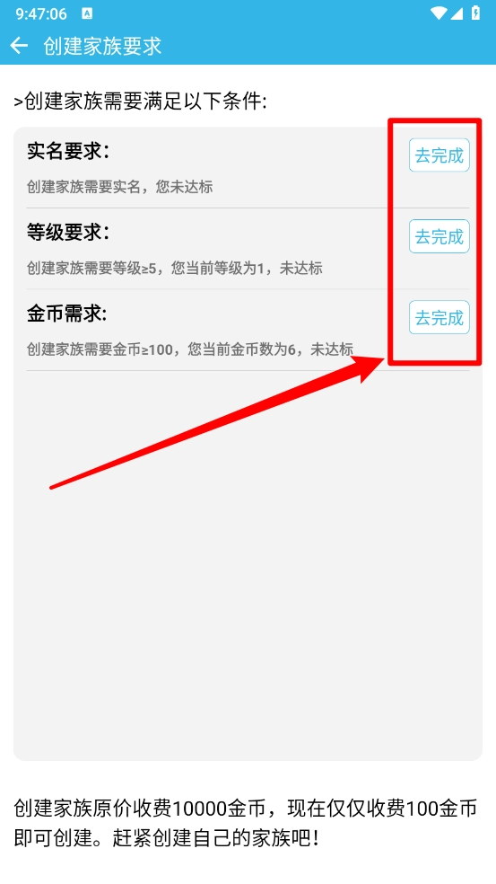 4、点击"去完成"对应的条件后就可以根据提示创建家族房间即可。