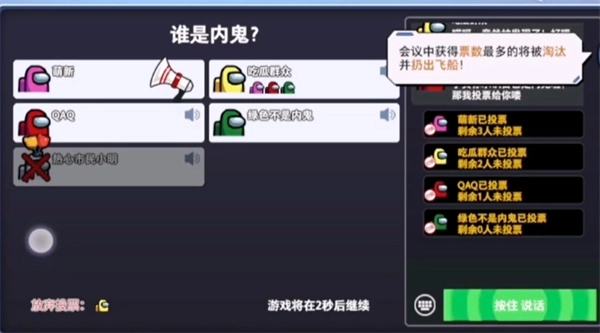 7、还能点击报告按钮,在会议室里,船员们可以依据线索推理出内鬼,得票数最多的角色会被淘汰。