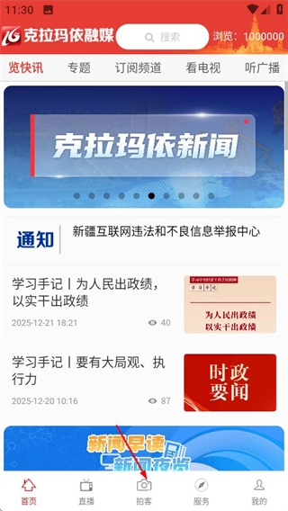 1、在克拉玛依融媒体中心首页找到并点击“拍客”选项,即可进入拍客页面。