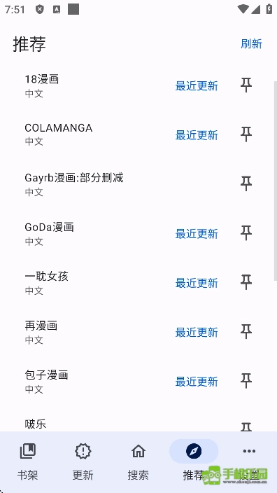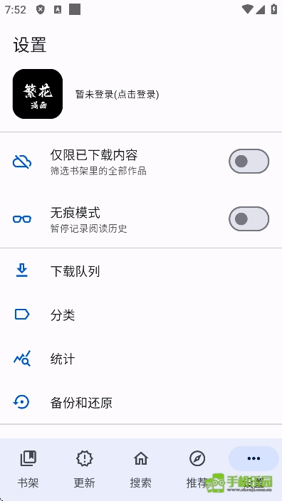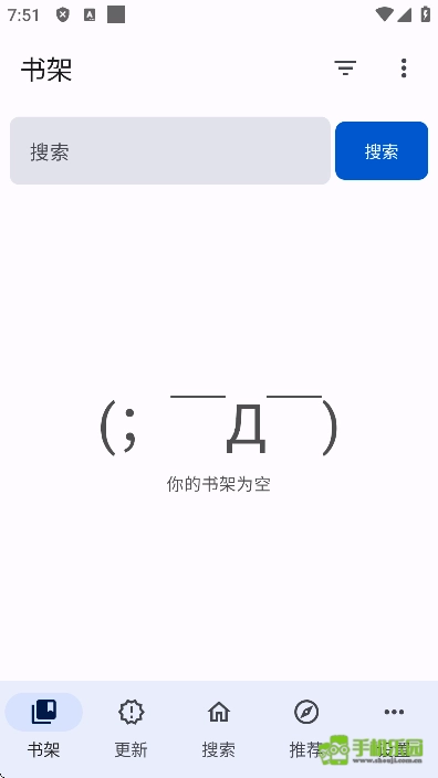 5. 正版界面设有书架、更新、搜索、推荐、设置五个栏目