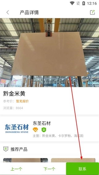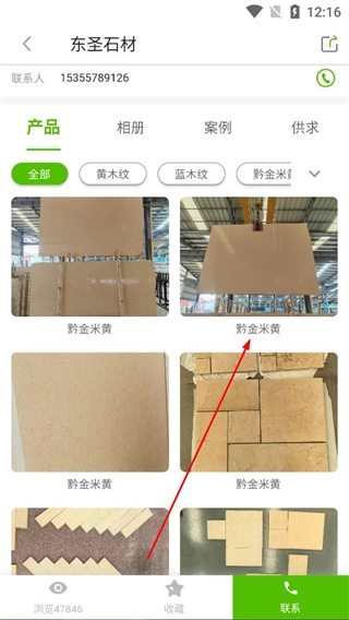 2、在东圣石材页面找到黔金米黄产品,点击进入其详情页面,查看该产品的相关信息。