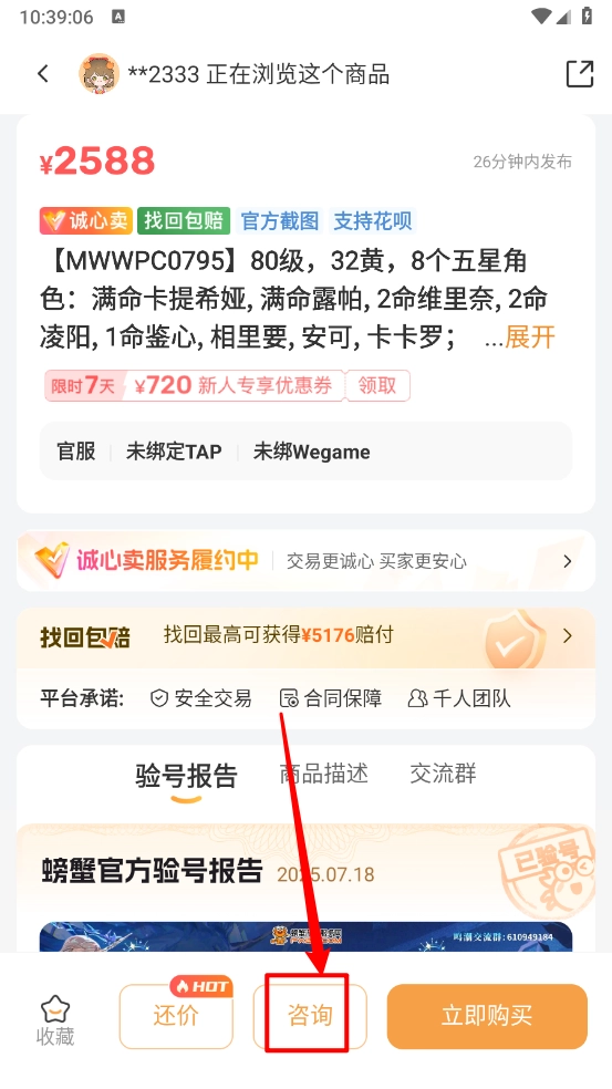 3、最后在账号详情页点击底部"咨询"即可和卖家沟通账号事宜。