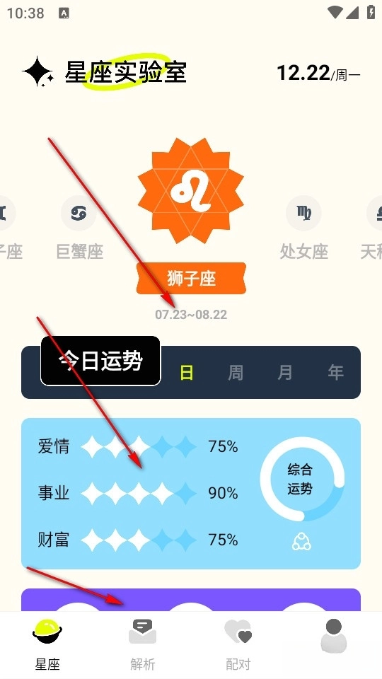在首页,我们可以了解到各个星座对应的具体出生年月范围,以及他们今日的运势情况与相关分析。