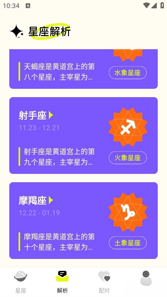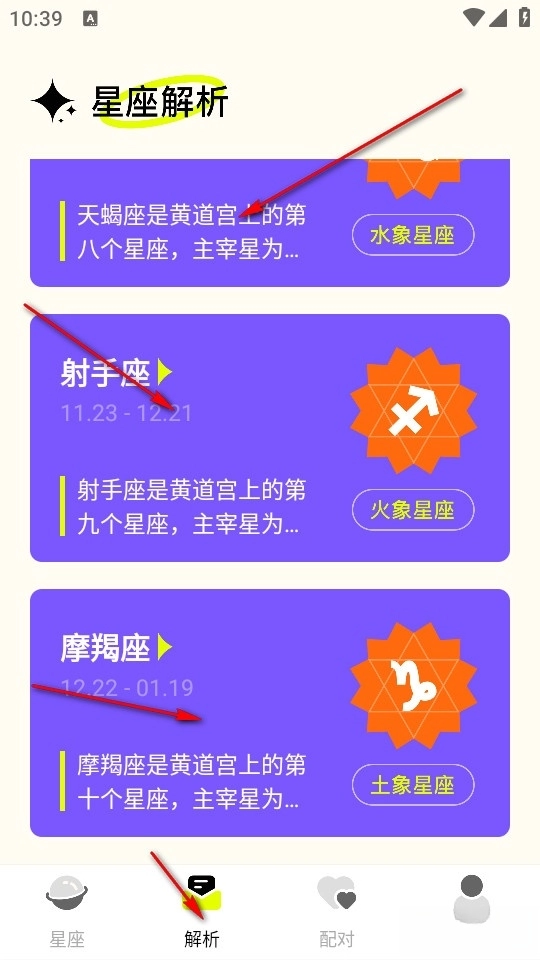 我们可以在首页底部找到解析入口,点击进入解析界面后,就能查看各个星座的解析内容。