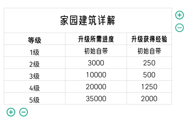 游戏里的家园建筑共有4个,每个建筑都有5个等级,初始等级为1级。后续升级时,各等级对应的建造进度依次是3000、10000、20000和35000,升级成功后获得的家园经验分别为250、500、1250与2000。家园经验可在左上角查看,而且这四个建筑升级所需的进度和材料完全相同。另外,每捐赠一次20个建材,能获得25点贡献,同时为当前建造的建筑增加50点进度。