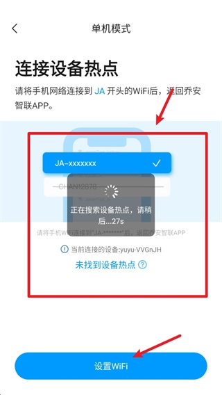 4、搜索设备热点(JA开头),连接成功后回到 App 页面并点击“设置 WiFi”完成绑定。