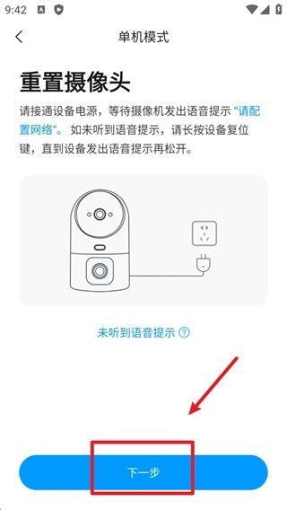 3、根据提示重置摄像头,等待设备发出语音提示“请配置网络”后,点击“下一步”。