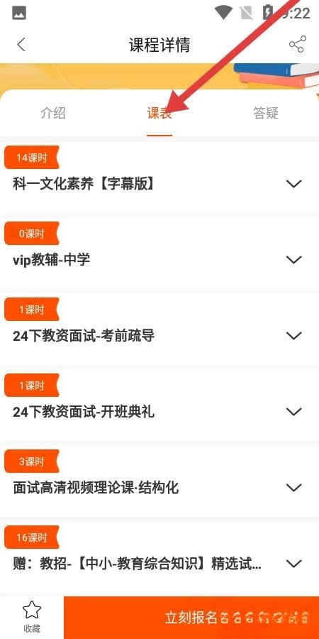 3、课程详情页课表详实科一文化素养等课程按课时罗列,从理论到面试辅导覆盖,立刻报名按钮突出,方便用户规划教资备考学习节奏。