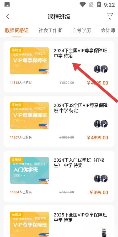 2、课程班级页面分类清晰,在教师资格证等项目下,展示了2026下全国VIP尊享保障班等课程,并标注了购买人数与价格,帮助用户挑选合适的备考课程。