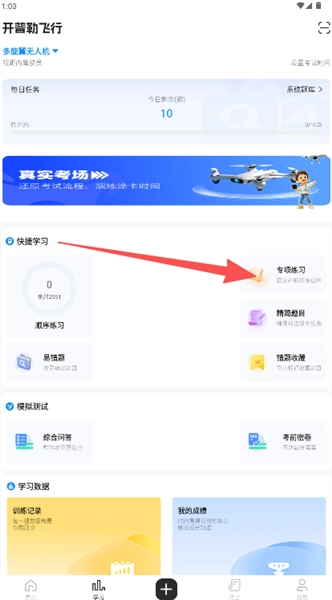 2、在学习首页找到“专项练习”的入口,点击进入后选择题库分类。
