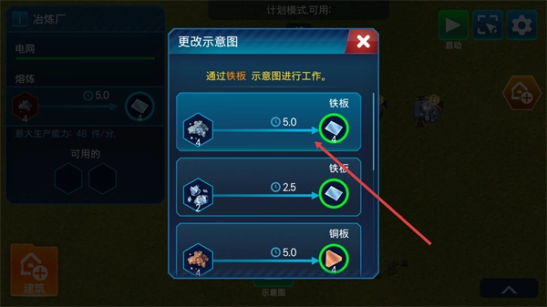 3、在【更改示意图】弹窗中,选择对应物料(如【铁板】)的生产流程,可调整冶炼的物料类型与效率。
