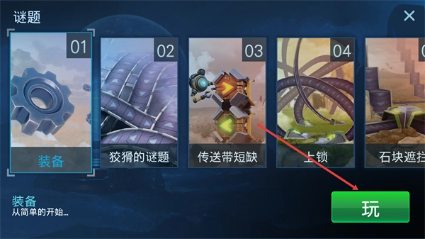 1、进入谜题界面后,选择【装备】关卡,点击绿色的【玩】按钮,就能进入相应关卡开始进行操作。